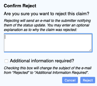 When Rejecting Claims, you can add an explanation for cause of the rejection. In addition, you can choose to require additional information. This will then change the subject of the e-mail to the Claimant from Rejected to Additional Information Required.
