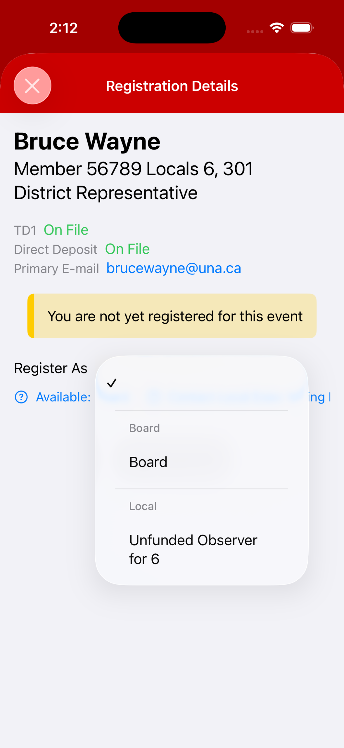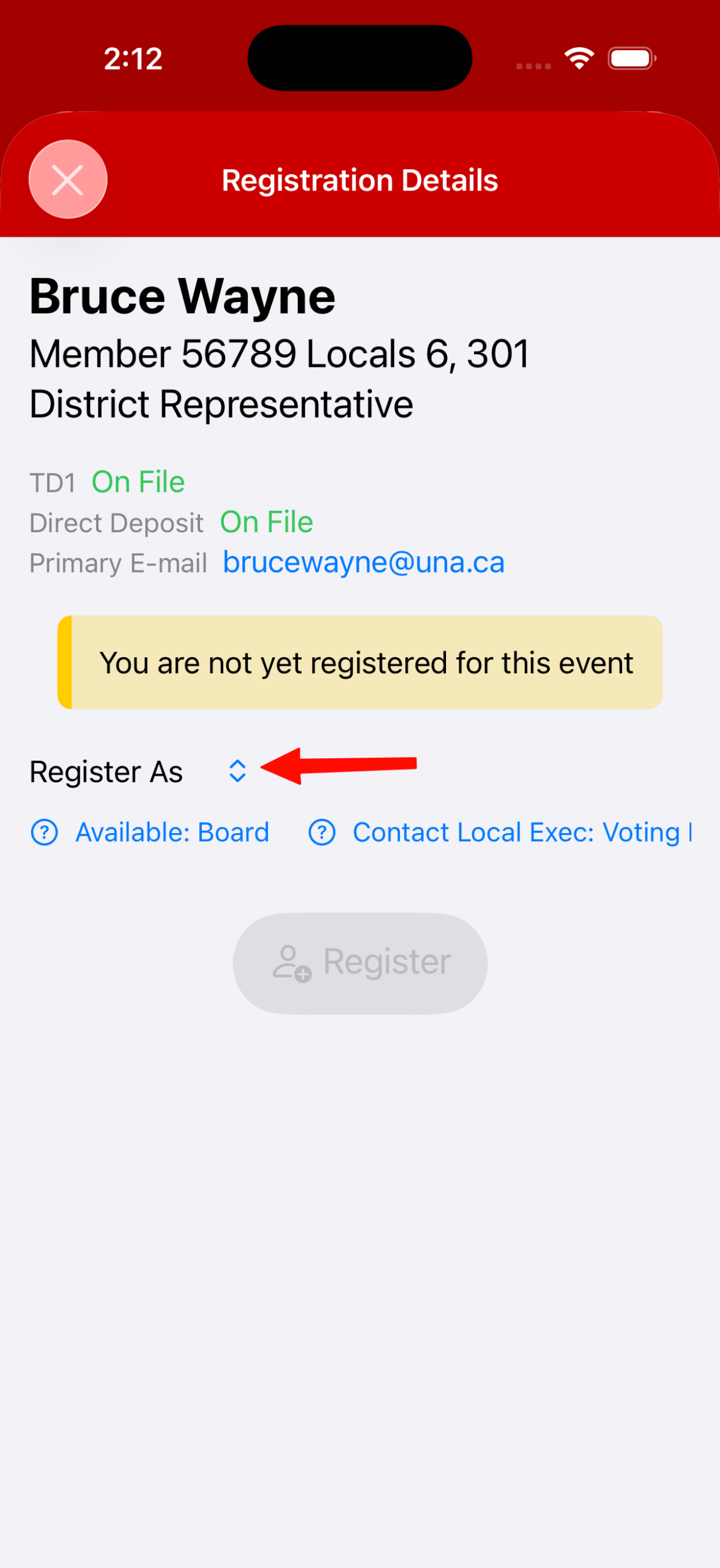 4. Tap on the Dropdown arrow beside Register As to choose your Registration Type. Available options will populate: