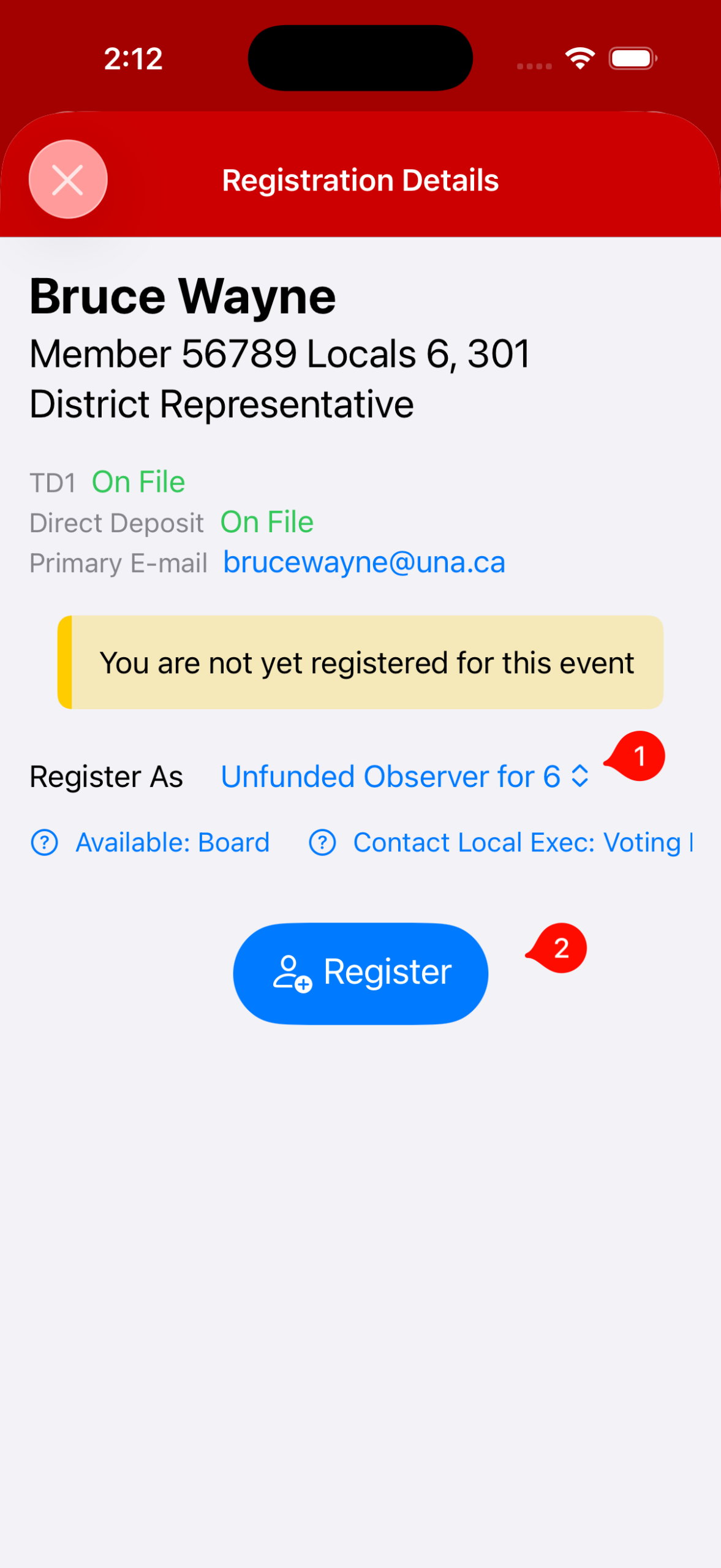 2. From the Event Detail page, you’ll be able to see your Eligibility (1), and choose from the drop down your Registrant Type:
