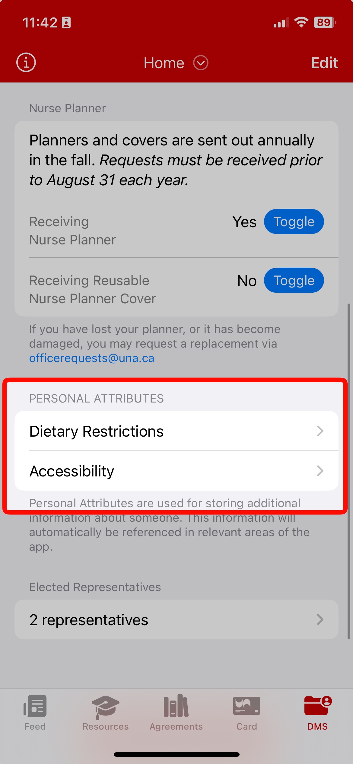 You can find and edit your Personal Attributes which will help specify any Dietary Restrictions or Accessibility Needs for Events.