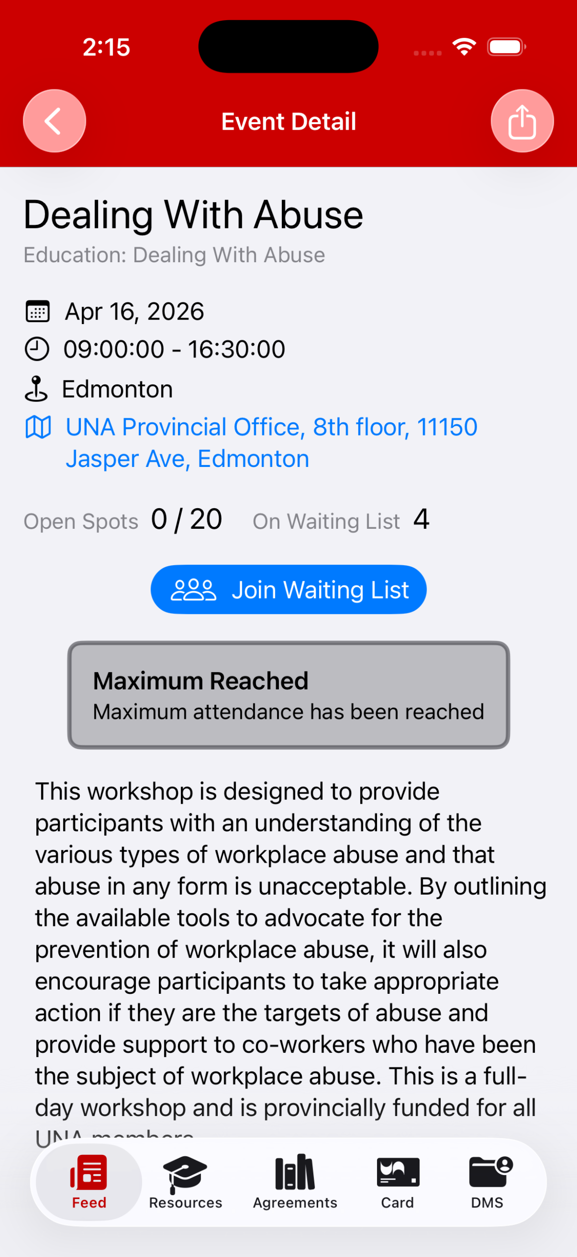 1. Navigate to the Event Detail page. If the Event is at attendance capacity, and the Waiting List feature is on, you’ll be able to Join the Waiting List: